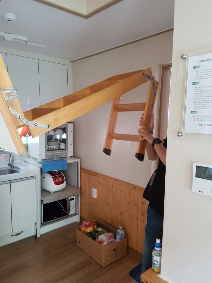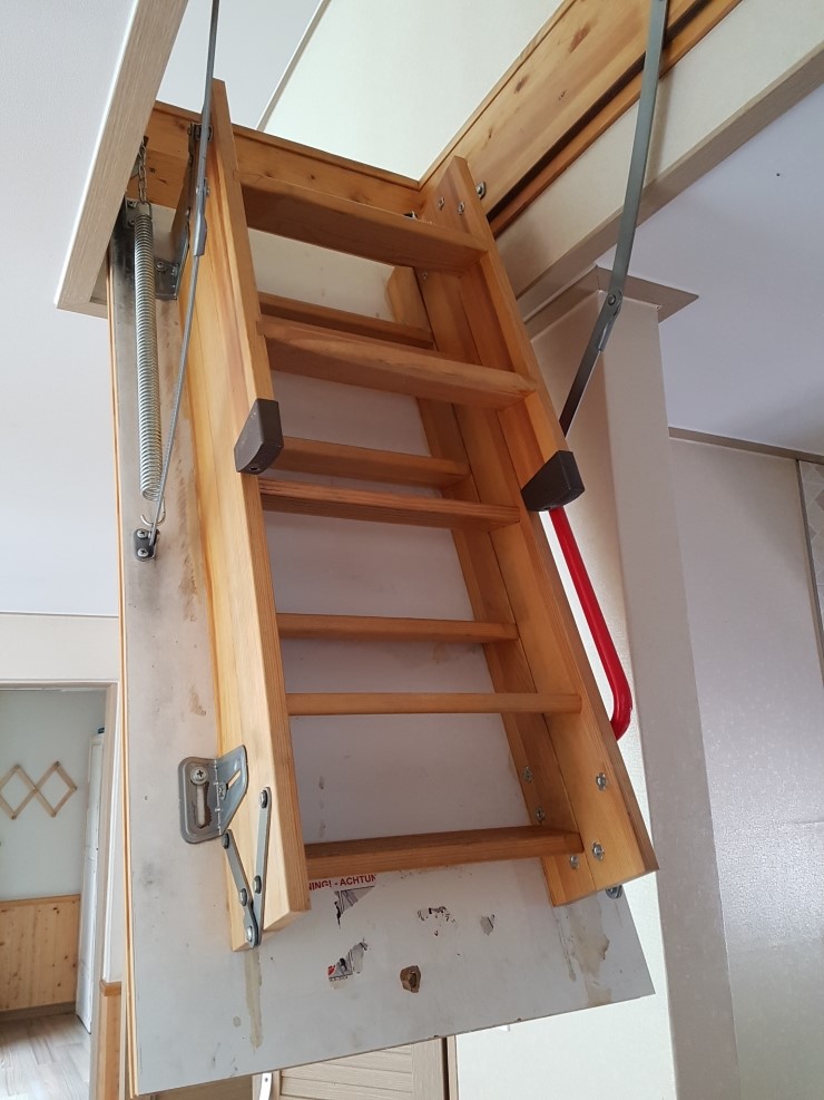 무게감이 상당한 계단이지만 스프링을 이용한 접이장치가 있어서 확 내려오진 않습니다.