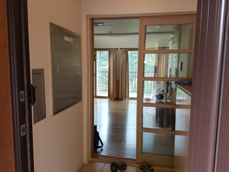 그 분이 어떤 관점에서 이 방을 1순위로 꼽았는지 대충 알것 같습니다. 사진에 보이는 문은 현관(정문)인데 건물의 뒤쪽으로 나있는 형태입니다. 그럴 수 밖에 없는 이유는 건물이 비탈진 경사에 위치하고 있으며 건물일부를 비롯해 앞쪽 데크는 지지대를 이용하여 공중에 떠 있는 구조로 이루어져있습니다.