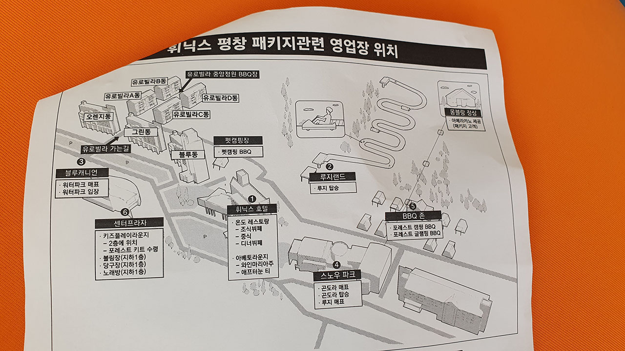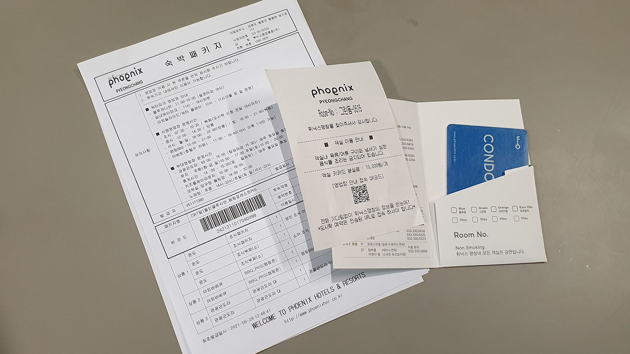 이번에 저희가 이용하는 휘닉스의 패키지는 '올인클루시브 캠핑포레스트'라는 상품인데요, 숙실과 조식을 포함해 야외 BBQ, 워터파크, 곤돌라까지 포함된 상품입니다. 이 외에도 추가금을 내고 더 이용할 수 있는 시설들이 있구요. 저 패키지 바우처를 들고 다니면서 확인받고 각 시설을 이용하는 방식입니다.