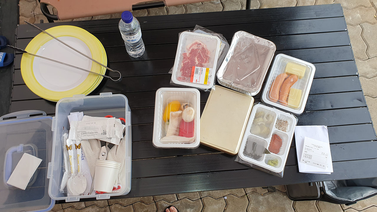 BBQ셋트가 아이스박스에 담겨 지급되는데, 펼쳐보니 별거 없네요. 아니 이걸로 어른 2, 아이 2이 배부를까 의심이...