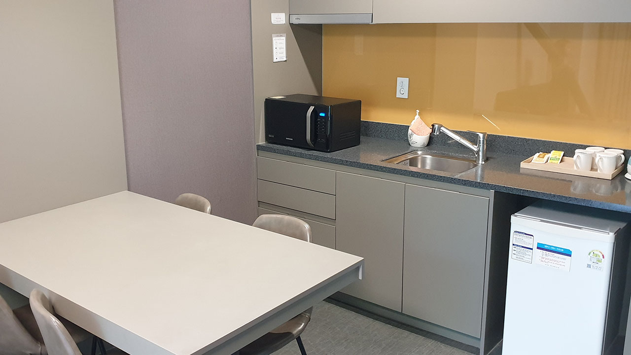 부엌공간과 식탁이 놓여있습니다. 조리할 일이 없어서 조리기구 없는 방으로 선택했는데, 잘했다 싶습니다. 없는 곳이 훨씬 깔끔할 수 밖에 없죠.