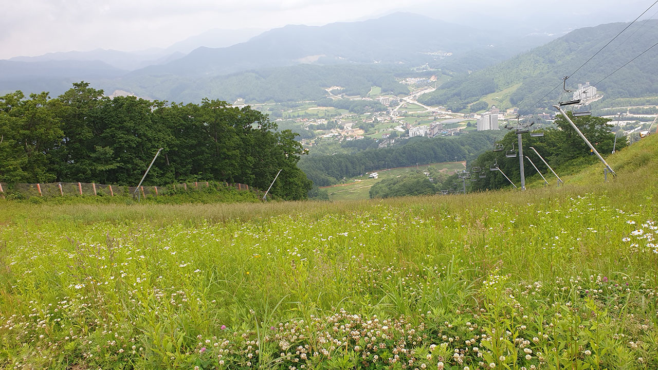 슬로프에는 이렇게 풀들이 빼곡히.... 느껴지는 각도가 상급자 코스같네요.