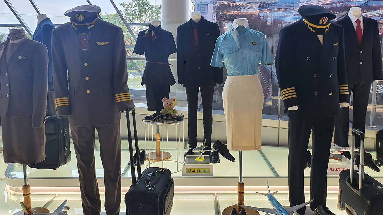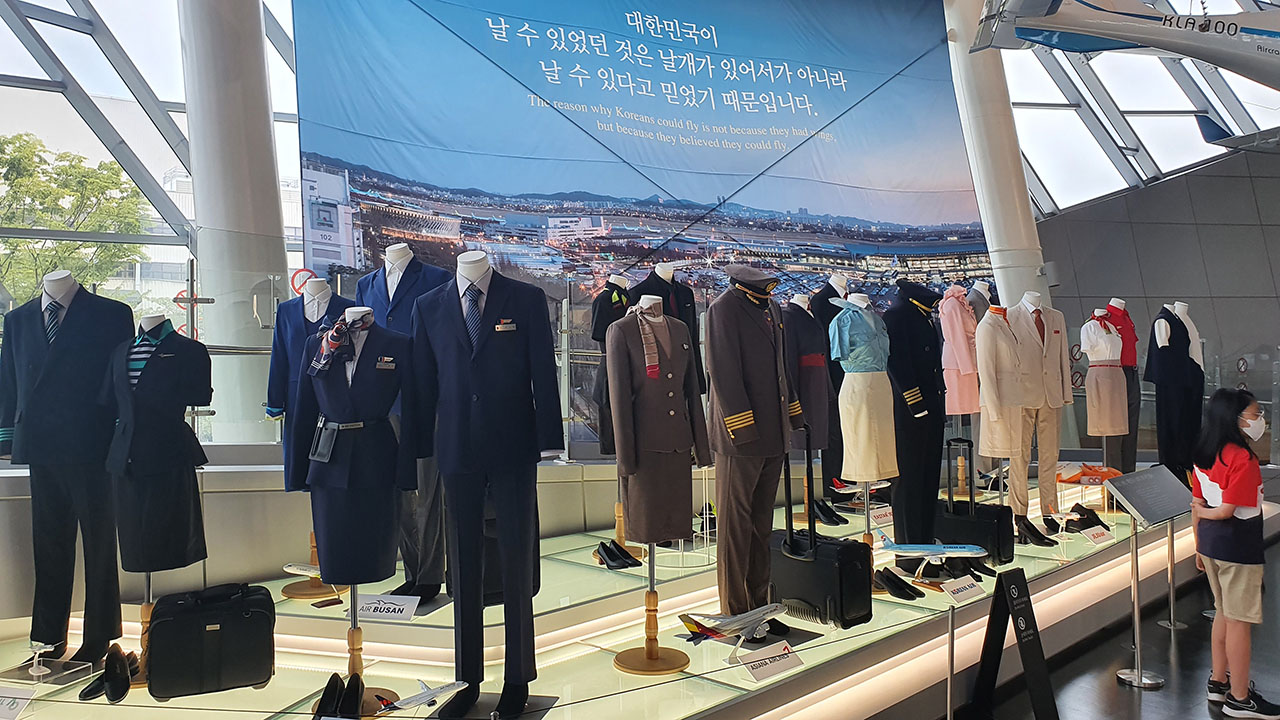 우리나라 여객항공사의 승무원복을 전시해놓은 공간입니다. 과거부터 현재 사용중인 복장까지 모두 전시해놓은듯 한데요, 복장보다 뒤의 현수막과 문구에 눈길이 갔습니다.