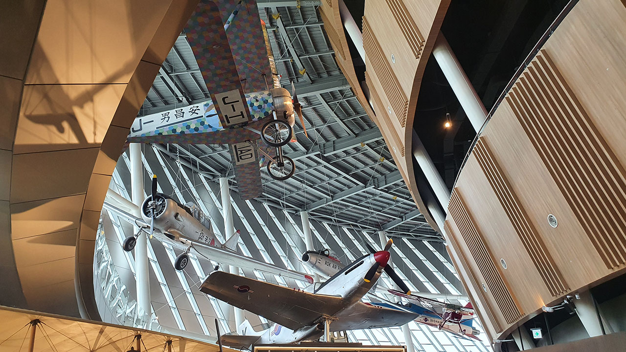 옥상에서 바라본 박물관의 모습입니다. 항공박물관,으로서 비행기를 상징할 수 있는 터보팬엔진의 모습을 형상화했다는 점이 매우 특징적인 건물입니다. 작은 건물이라면 특색있네~ 멋있네~ 로 끝날 수 있었겠지만 국립박물관이기에 가져야 할 크기를 전제로한다면 아마도 건축에 많은 비용이 쓰여졌을거란 예상이 됩니다. 하지만 특징이 명확한 항공박물관이기에 그로 인한 장점이 더 클것이라는 생각도 해봅니다.