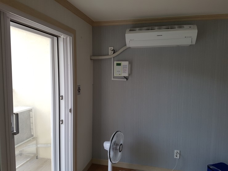 베란다창 주위에 눈에 띄는 두 가지가 있는데 하나는 자동블라인드, 나머지 하나는 에어컨 충전시스템입니다.