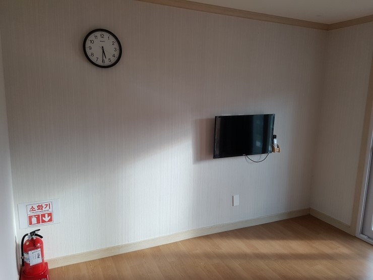 국립이지만 신축휴양림답게 에어컨이 설치되어있어서 여름철 이용에 무리가 없어보이고, TV는 벽걸이로 고정되어있어 내부공간 활용에 조금이나마 나아보입니다. 건물앞으로 보이는 뷰에서는 자동차가 없고 잔디와 수목만이 보여짐으로써 이곳이 휴양림임을 더 강조하는듯 합니다.