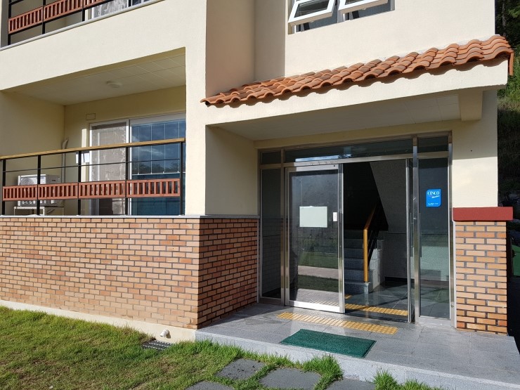 휴양관의 출입구는 사진에 뚜렷이 보이는 가운데 출입구 외에도 양끝으로 출입구가 하나씩 더 마련되어 총 3개입니다.