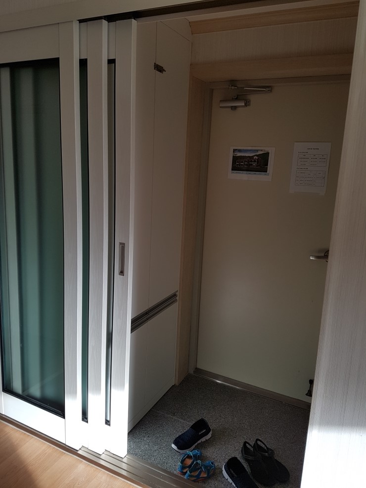 숙소의 출입구(현관)입니다. 특이하게 현관의 중문이 3개로 나누어진 미닫이문으로 이루어져있습니다. 휴양림에선 쓰지 않을법한 문인데... 특이하네요.