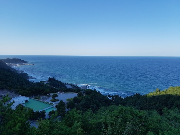 휴양림 관리동 앞의 주차장에서 바라본 동해 전경.