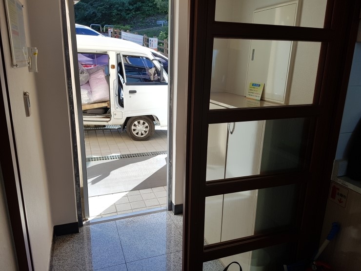 건물 뒤편으로 출입구가 있는 형태인데 우리가 머문 321동은 건물뒷편의 바닥과 동일한 높이로 되어있어 진입이 쉬운 장점이 있습니다. (건물 앞에서 바라보았을때는 2층입니다. 오르막에 위치한 건물의 특징이죠)