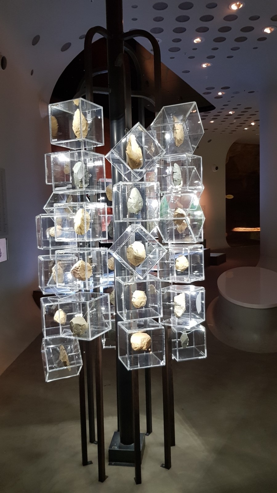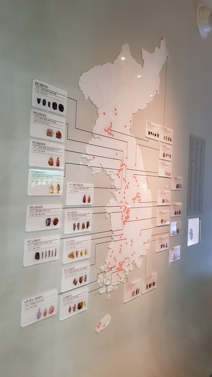 고대의 각종 돌을 투명 아크릴 케이스에 각각 담아 조명을 비춰주고 있습니다.