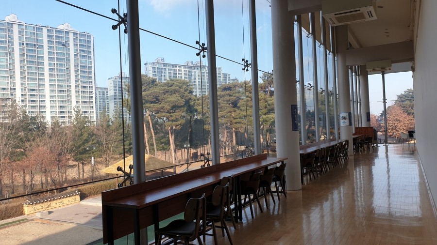 유리로만 이루어진 전면을 통해 밖을 보자니 이 곳을 개방적인 공간을 만들고자 한 의도가 읽히네요.
