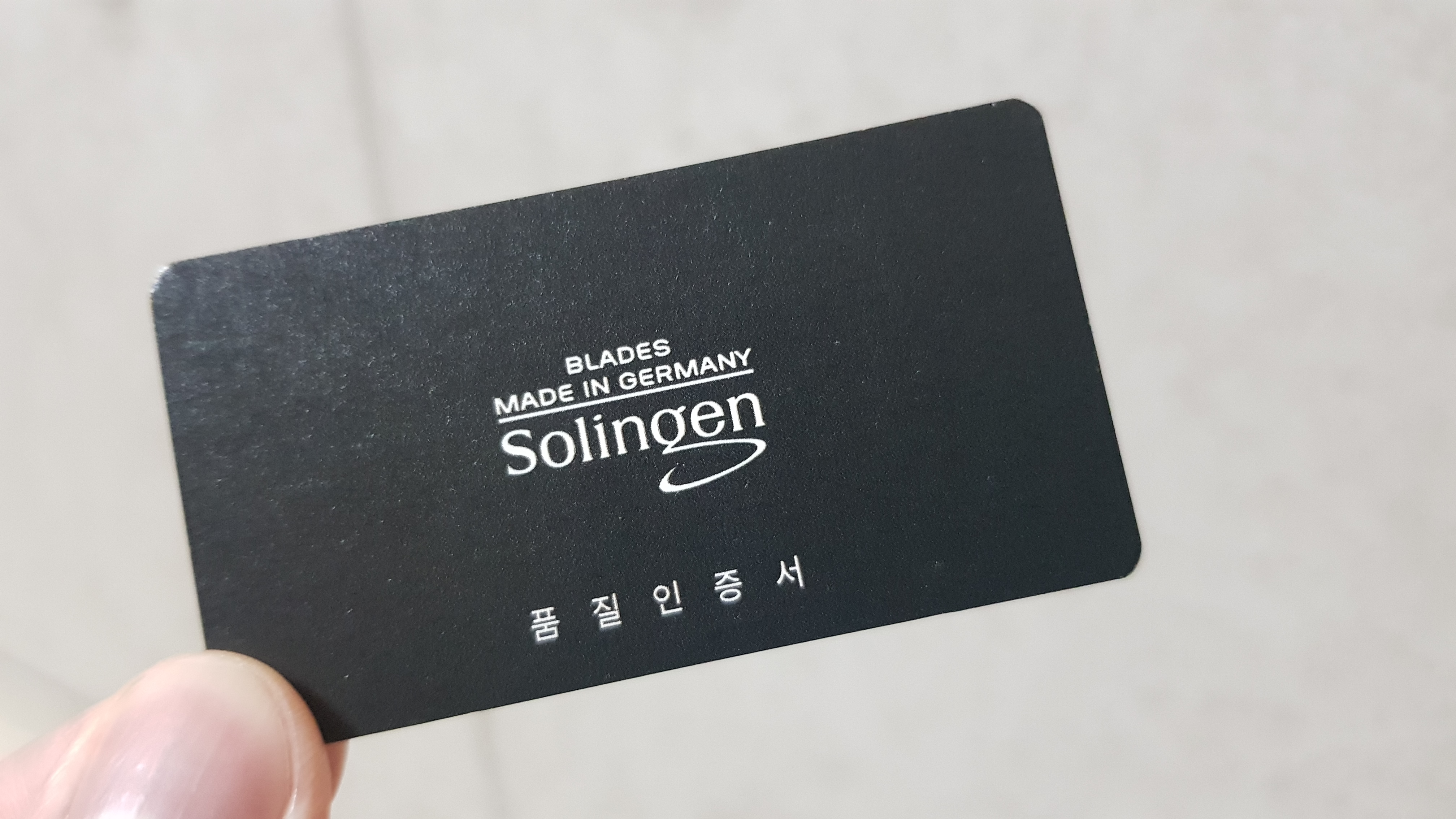 동봉된 인증서는 소비자에게 사실 있으나 마나한 품목입니다. 하지만 면도를 향한 남자의 로망에 게르만 퀄리티로 감성만족을 더하는 효과는 분명 있습니다. 면도날 역시 칼은 칼이기에... 독일산이라는 출신성분이 주는 고급감, 기대감은 마케팅의 중요한 역할일듯 하네요.