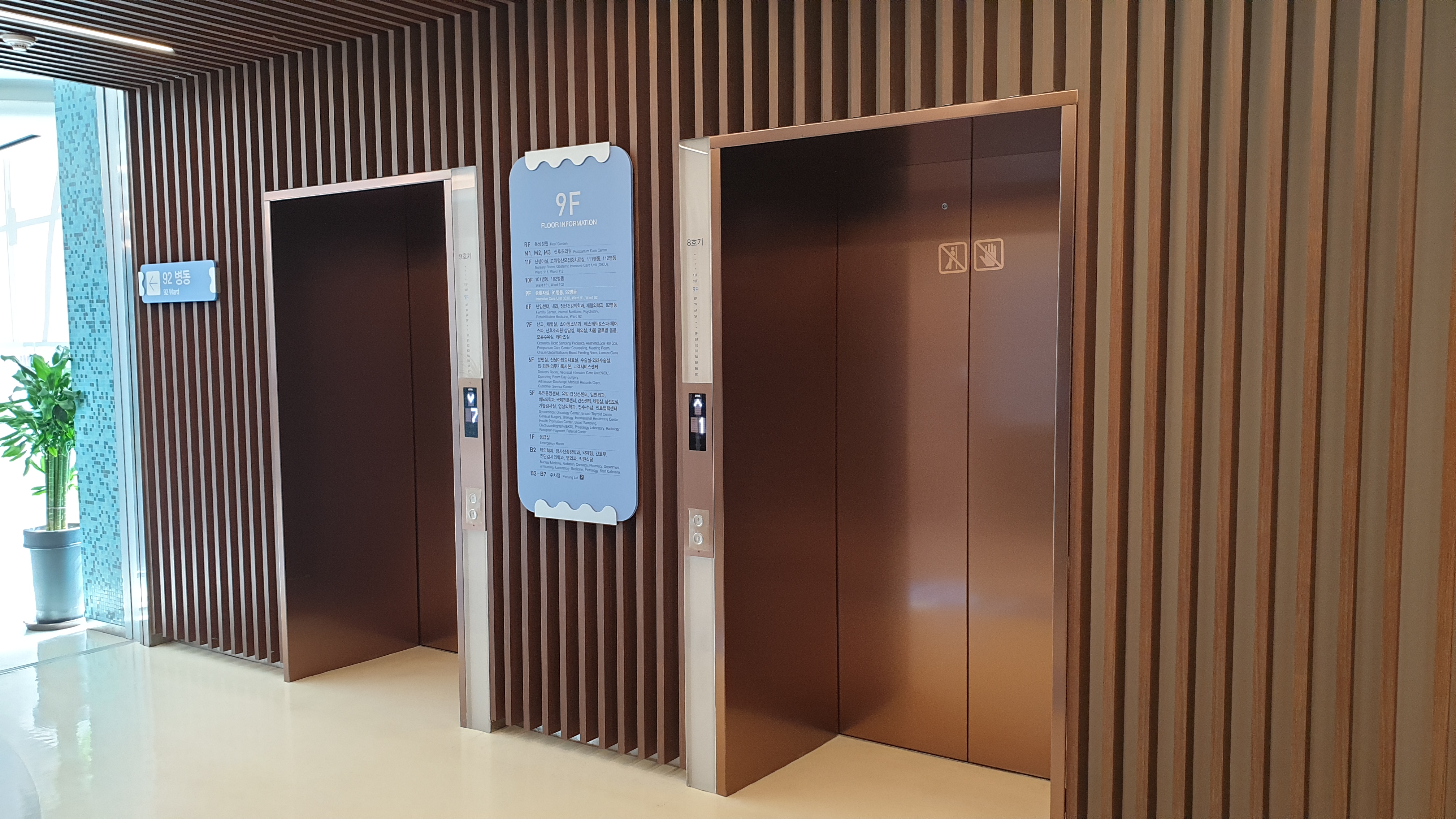 흔히 볼 수 있는 병원의 느낌이 아니죠? 고급스럽고 따뜻한 느낌입니다. 총 4기의 승객용 엘리베이터가 있고 사진 뒤쪽으로 화물용(비상용)엘리베이터 1기가 있습니다.
