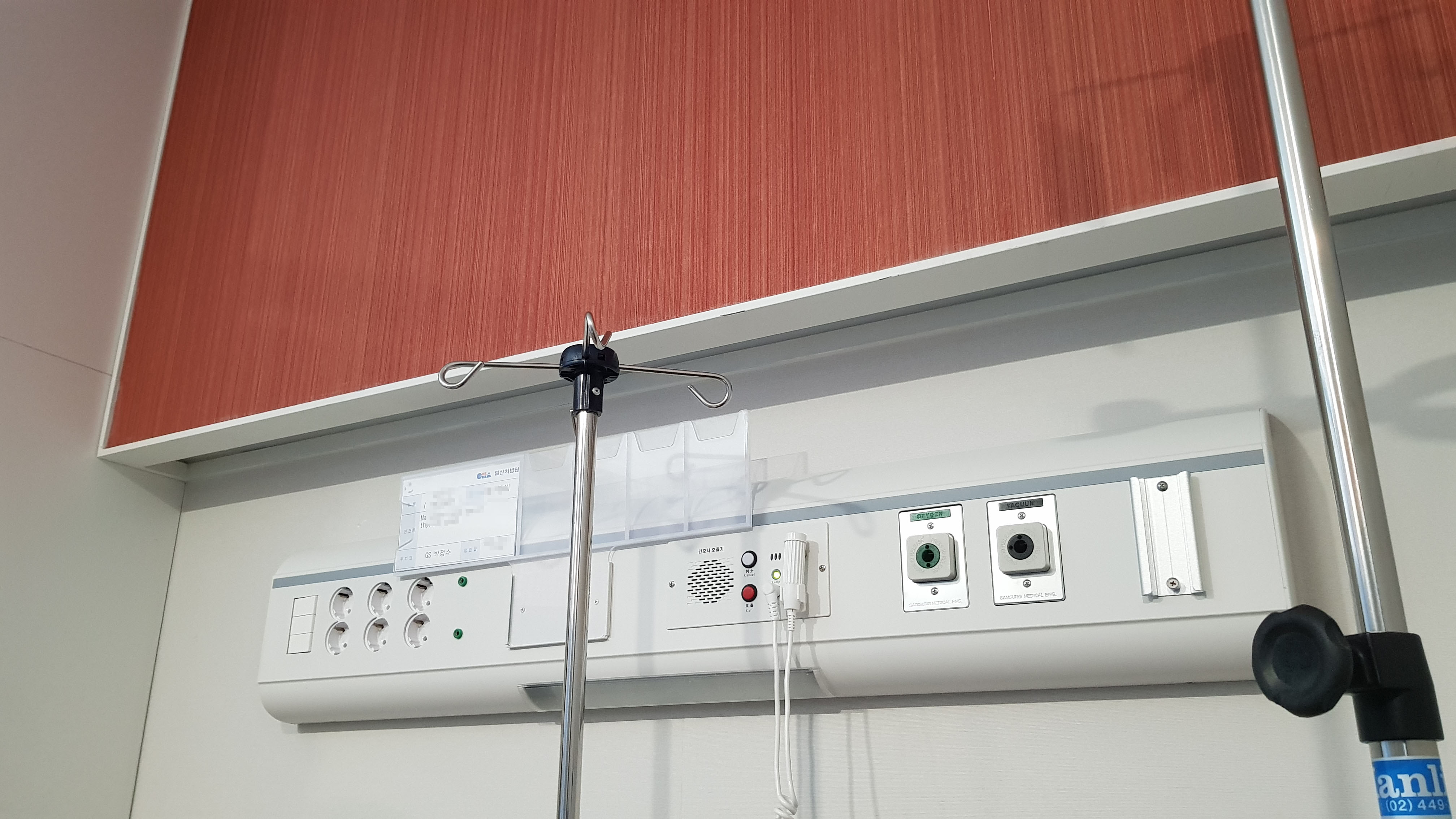 저 헤드콘솔뿐만 아니라 병원의 모든 것이 새것입니다. 하지만 환자 가까이서 자주 눈이 가는 시설이 깨끗한 새것이라면 더 기분이 좋겠지요. 콘솔 가운데 붉은 버튼이 간호사 호출버튼이고 그 옆에 달린 것은 호출버튼 겸 마이크라고 합니다. 거동이 불편하고 아픈 수술 후 첫날에 아무래도 사용할 일이 있을테고, 저희도 그때 몇 번 사용했습니다.