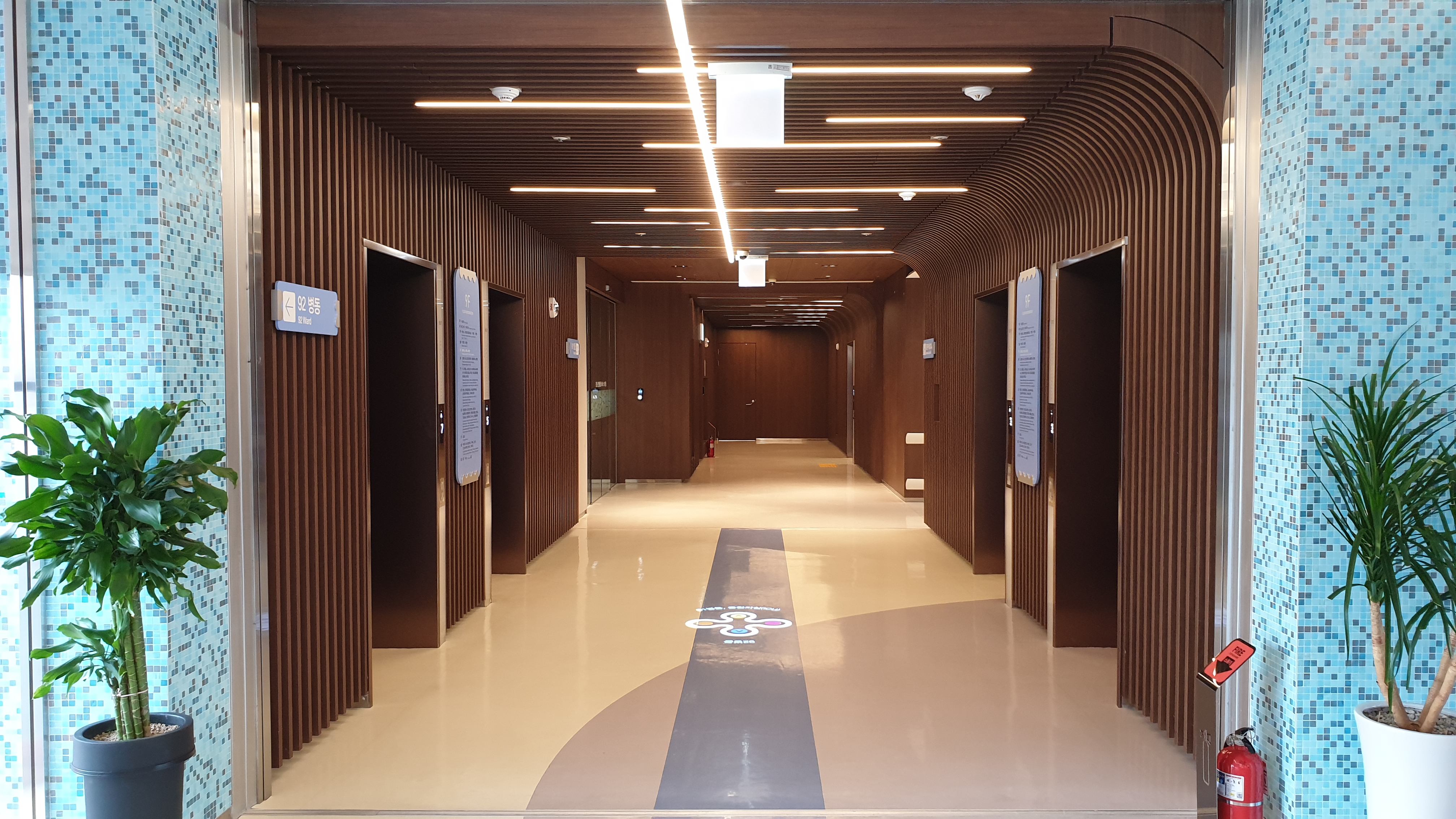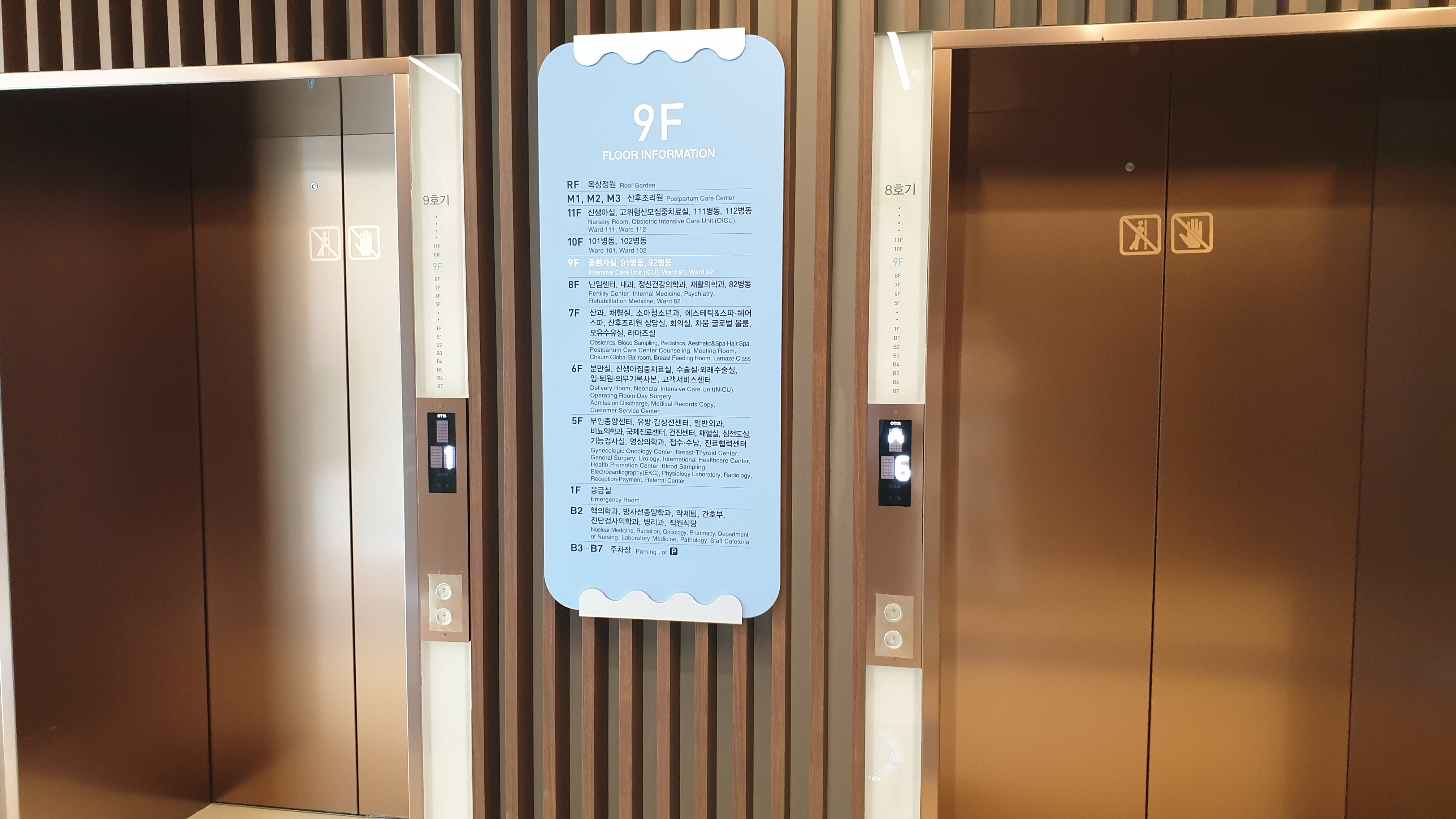 흔히 볼 수 있는 병원의 느낌이 아니죠? 고급스럽고 따뜻한 느낌입니다. 총 4기의 승객용 엘리베이터가 있고 사진 뒤쪽으로 화물용(비상용)엘리베이터 1기가 있습니다.