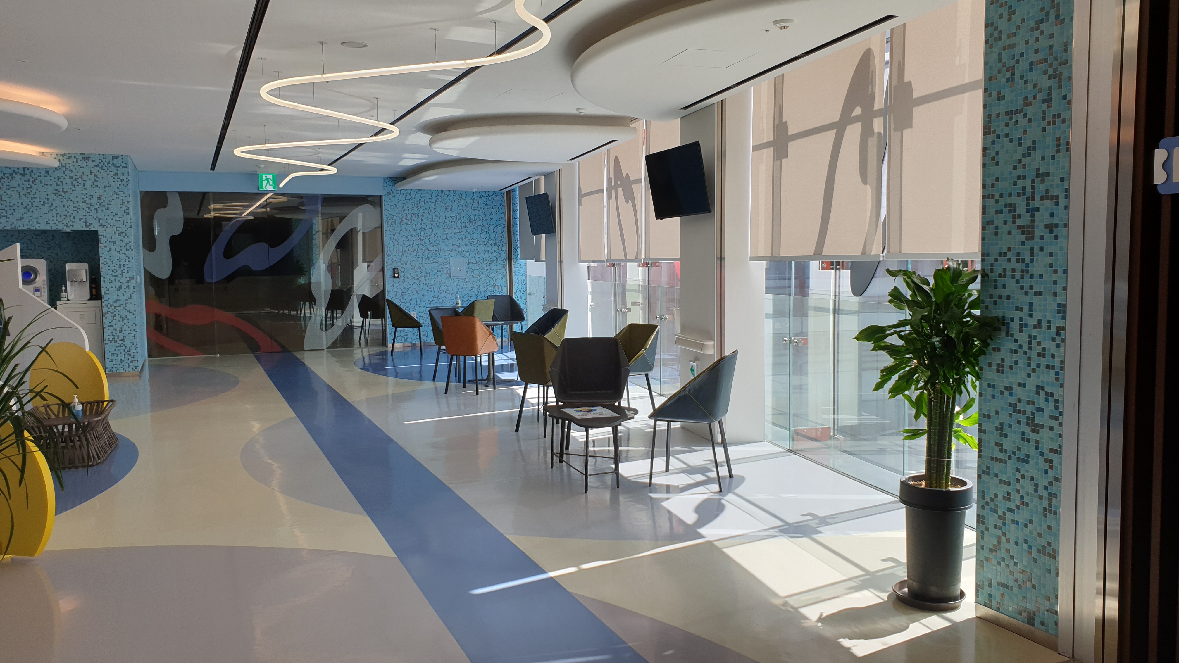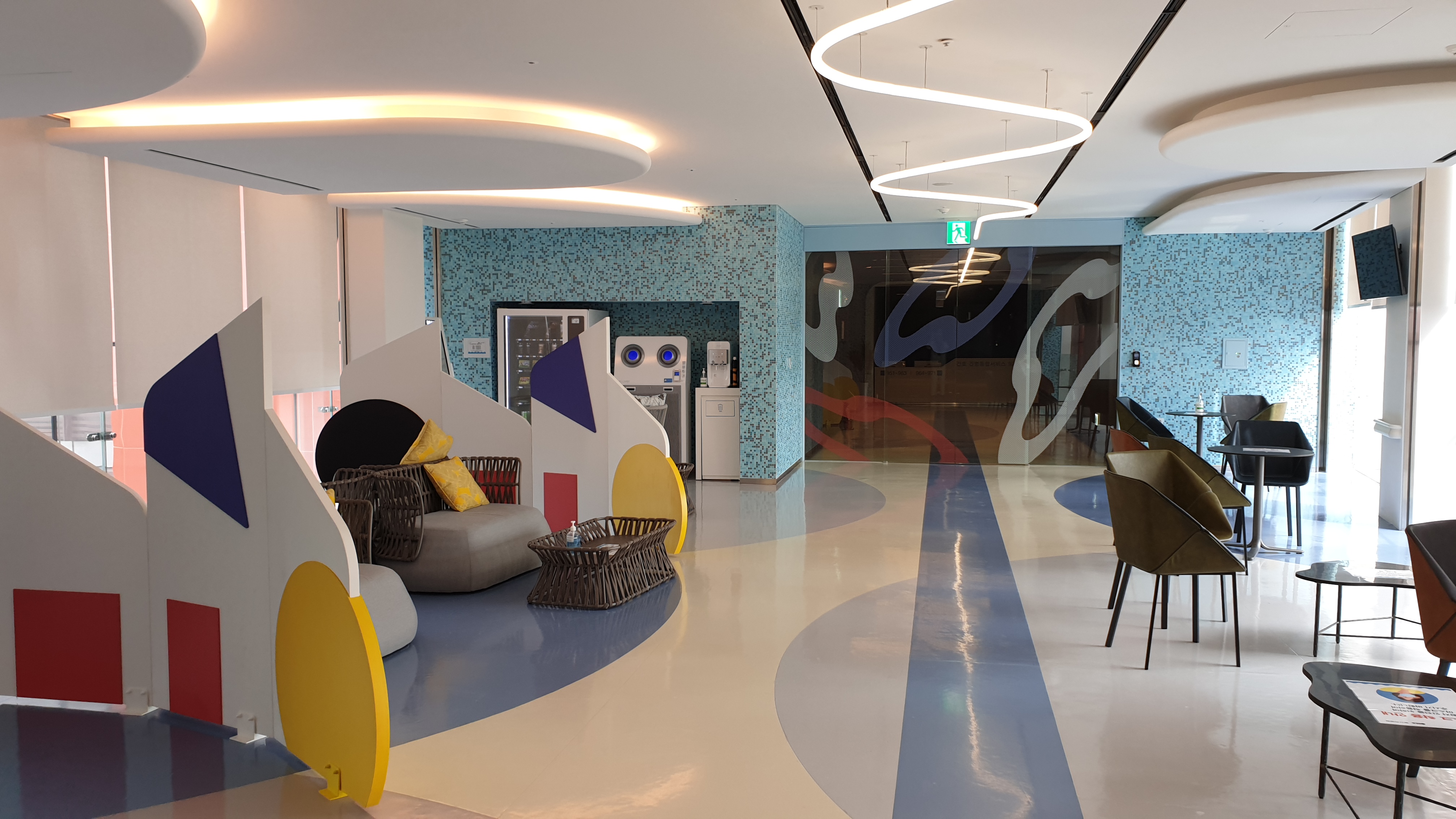 휴게실은 병실공간과 확연히 다른 느낌입니다. 굳이 차분한 톤으로 맞추기보다는 경쾌한 느낌으로 환자와 가족들에게 활력을 주려 한것 같네요.