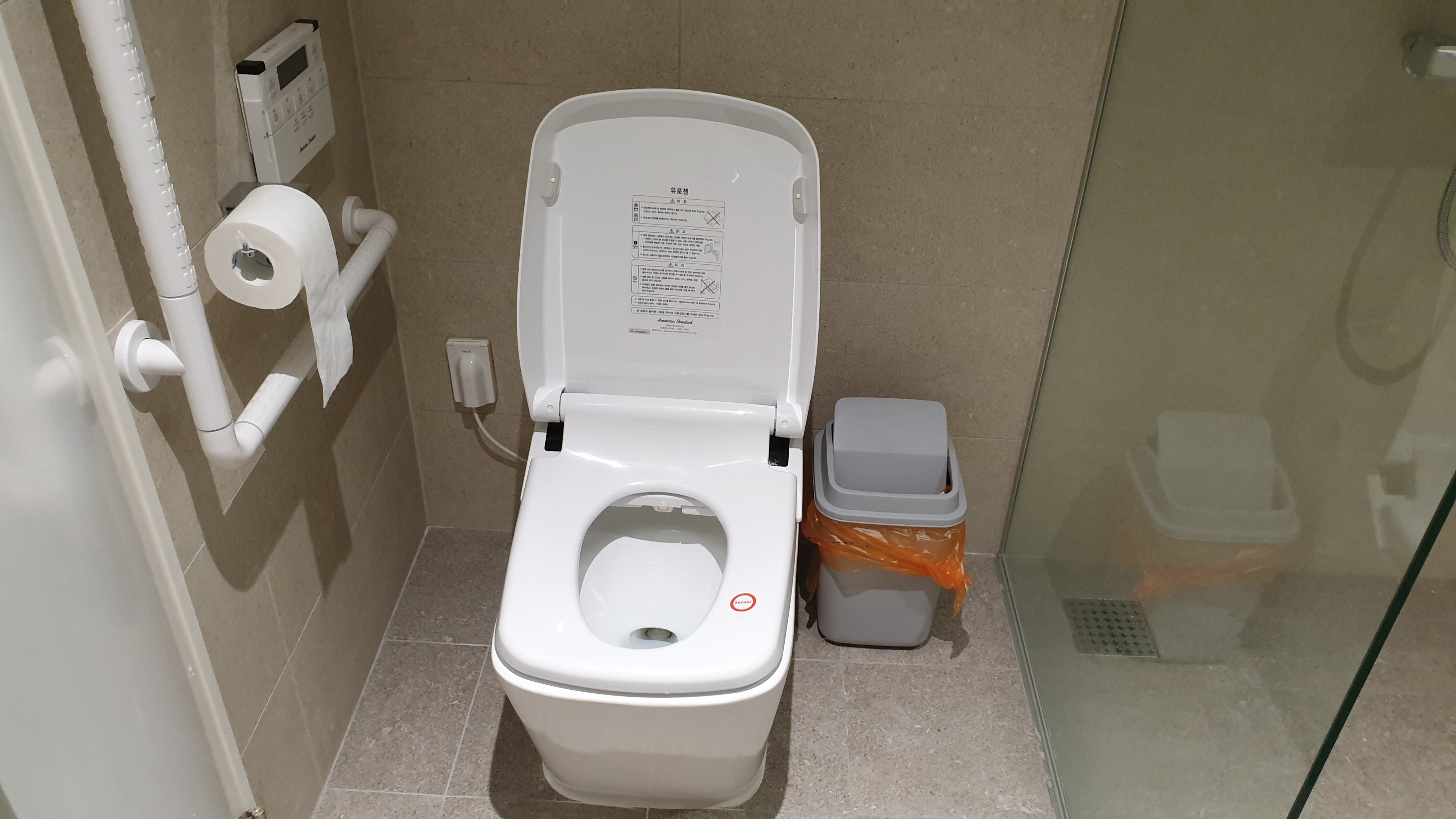 역시나 모든 시설이 새것이며 관리가 잘 되고있는 편입니다. 용변 후 따로 물내림 버튼을 누르지 않아도 사람의 움직임을 감지해서 볼일이 끝났다싶으면 물을 자동으로 내립니다. 거동이 불편한 환자를 위한 스마트한 기능이라 생각됩니다.