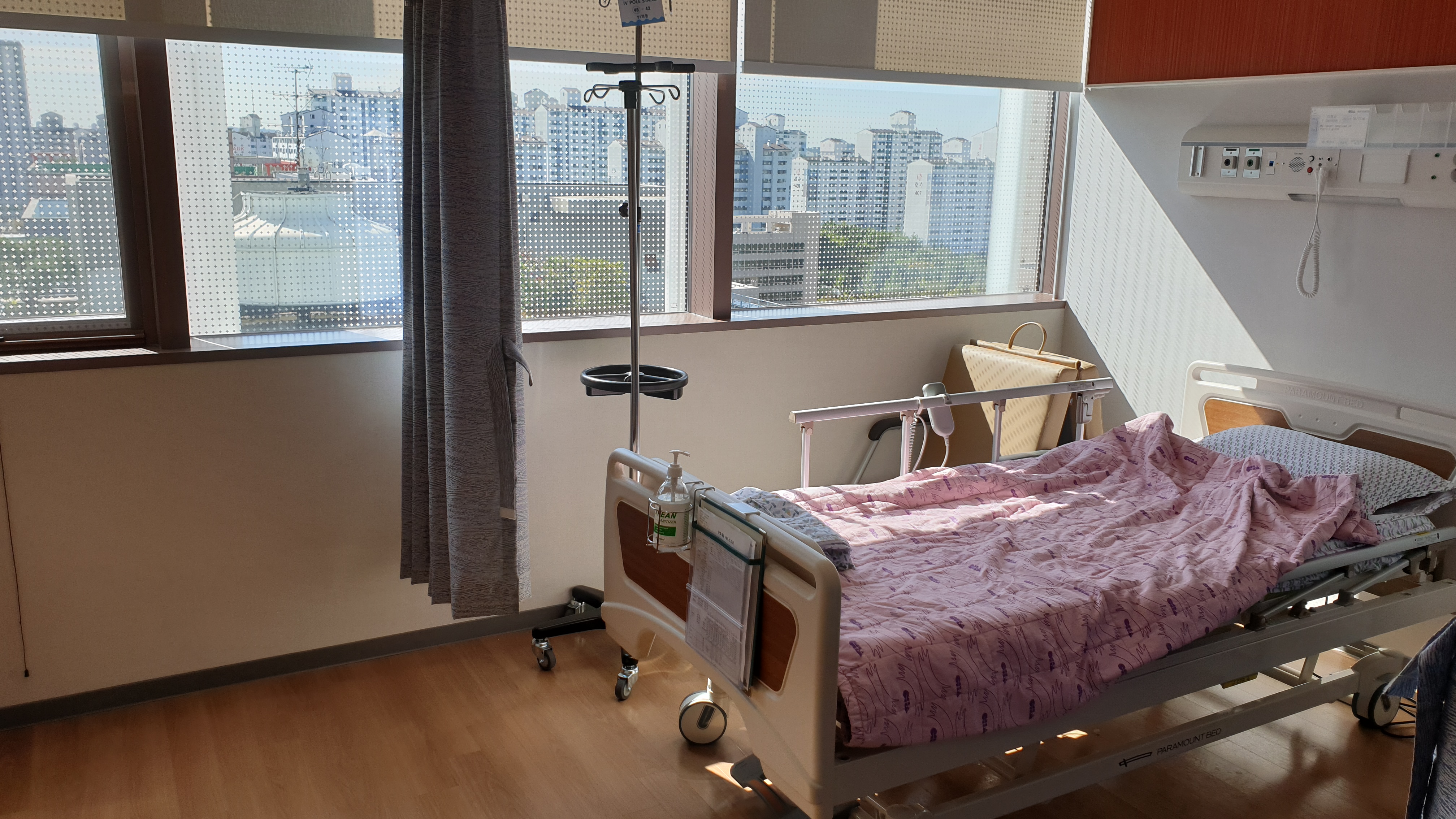 환자 침대 옆 창가쪽에 보호자용 의자 겸 간이침대가 보입니다. 그런데 모든 병상에 적용되는건 아닙니다. 개수가 정해져있어서 모두가 쓸수는 없다고 하네요.