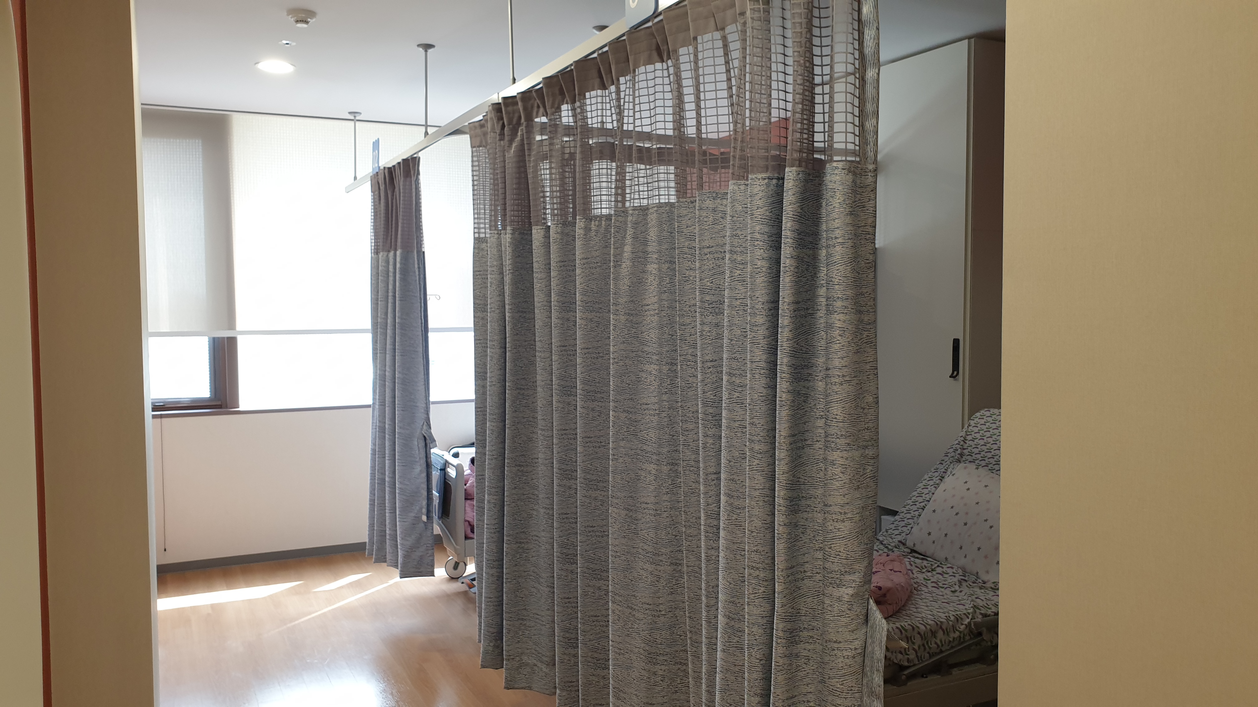 어느 병원에서나 자주 보게되는 구획용 커튼입니다. 병원분위기상 핑크나 이쁜 컬러로 적용해도 이상하지 않을법한데, 의외로 평범한 컬러를 사용했네요.