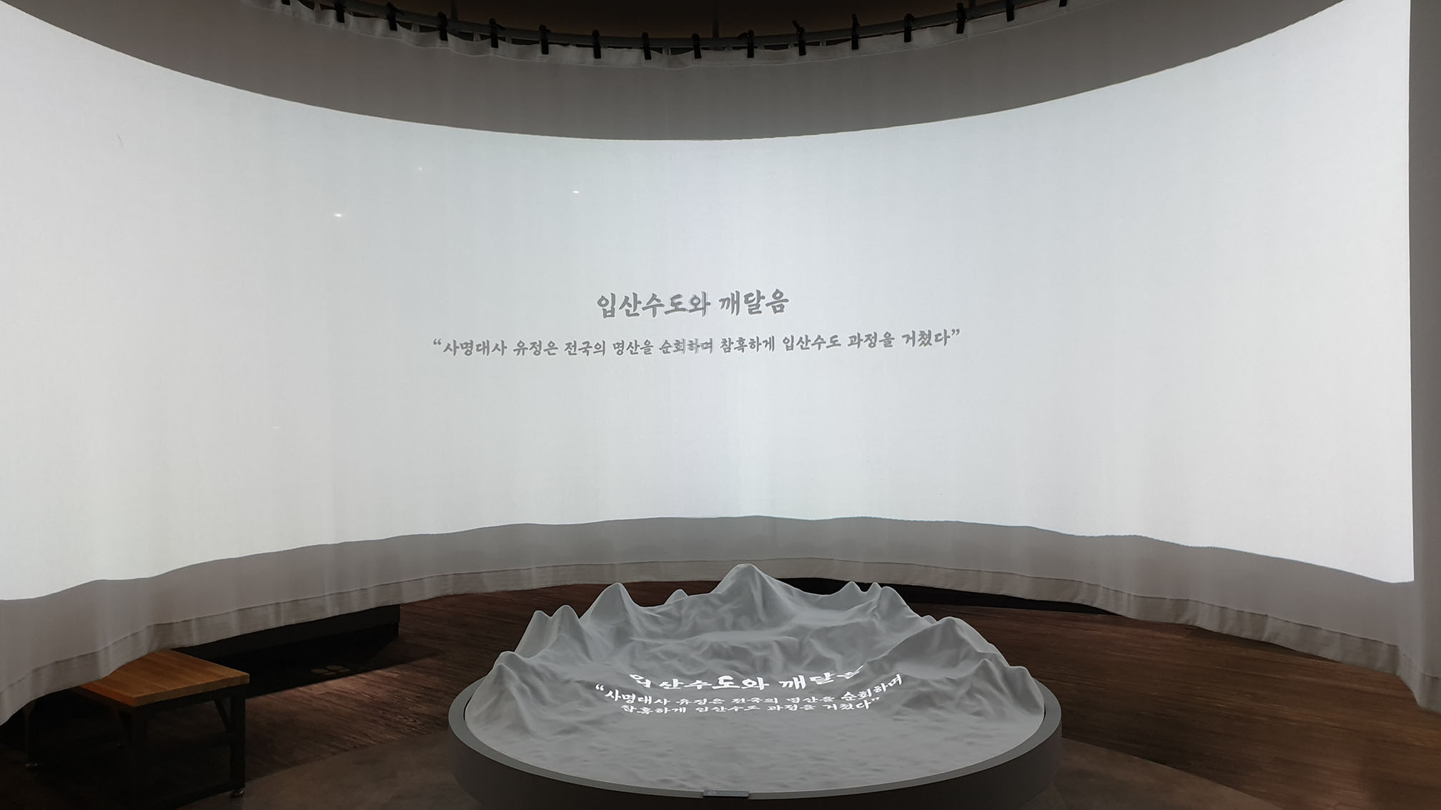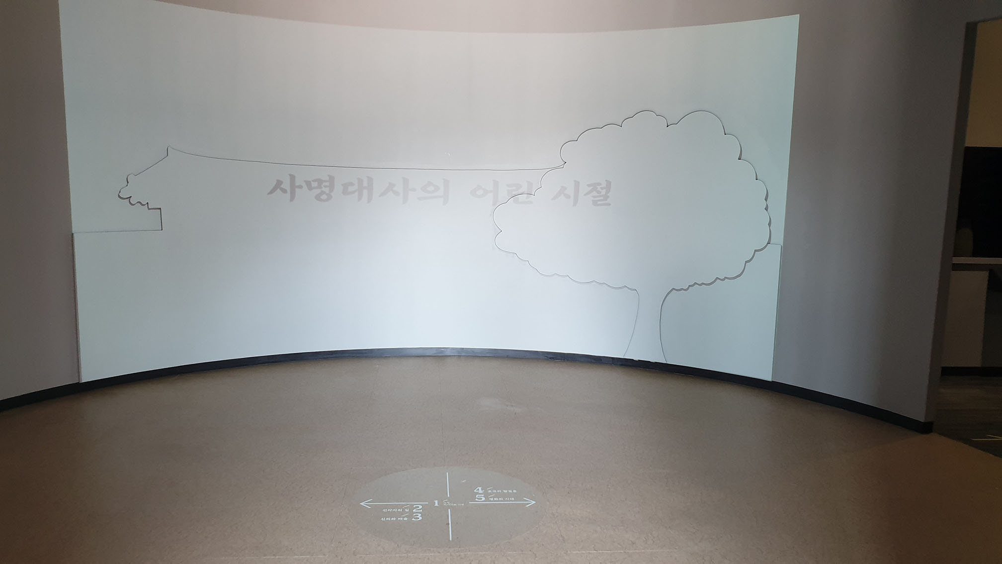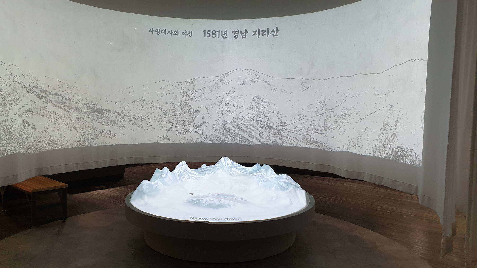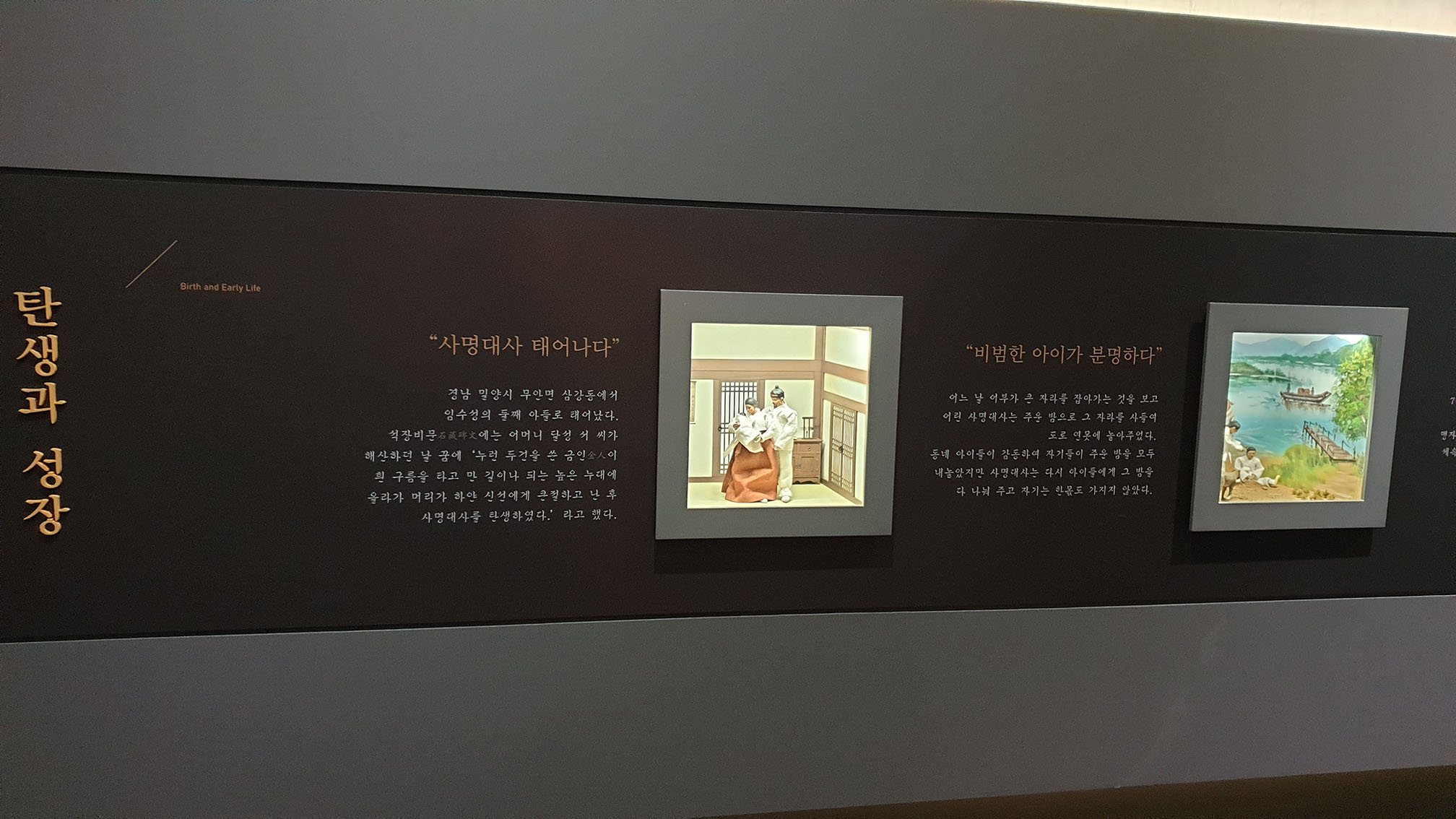 기념관/공원 옆으로는 이렇게 저수지가 나있는데 새로 만든 곳은 아니고 원래 농수용으로 쓰이던 저수지입니다.저수지쪽에서 바라보면 이런 느낌입니다.대문을 지나 들어가봅니다. 어흠~대문으로 입장하면 좌측에 관리실이 이렇게 자리잡고 있습니다. 우측으로는 화장실이 위치해있구요.기념관으로 가는 길이 뻗어 있습니다.가는 길에 사명대사의 활약을 타일아트로 만든 벽화가 보입니다. 외교활동에 관한 모습인것 같구요,다른 한쪽은 승병을 일으켜 이끄는 장수의 모습을 표현한 것 같네요. 기념관은 이렇게 생겼습니다. 문은 정중앙에 보이는 입구와 반대편으로 나있는 출구 두 곳 입니다. 기념관에 들어가기에 앞서. 기념관을 등지고 보면 이런 느낌입니다.현판에는 사명대사기념관이라고 쓰여있습니다.실내로 들어가기 전 전실의 역할을 하는 공간입니다. 슬리퍼는 걸음 소리가 나는 신발을 신은 관람객을 위한 용도인가 봅니다. 전시에 대한 안내가 적힌 팜플렛이 비치되어 있고 그 옆에 스탬프 순서가 나와있네요.내부로 들어가면 바닥에 공간구분을 해놓았고 순서에 따라 스토리에 맞춰 사명대사를 알아갈 수 있습니다. 첫 시작은 탄생과 함께...작은 모형으로 만들어 놓았지만, 퀄리티가 나름 상당합니다.어린 나이에 출가라니... 위인은 역시 다른가 봅니다.가장 기억에 남는 전시공간은 여깁니다.둥글게 둘러쌓인 커튼형태의 스크린에 시대상황을 설명하는 영상을 쏘고바닥에 놓인 구조물에도 싱크를 맞춰 사명대사의 활동을 풀어냅니다.천장에 이렇게 프로젝터가 설치되어 있지요.
