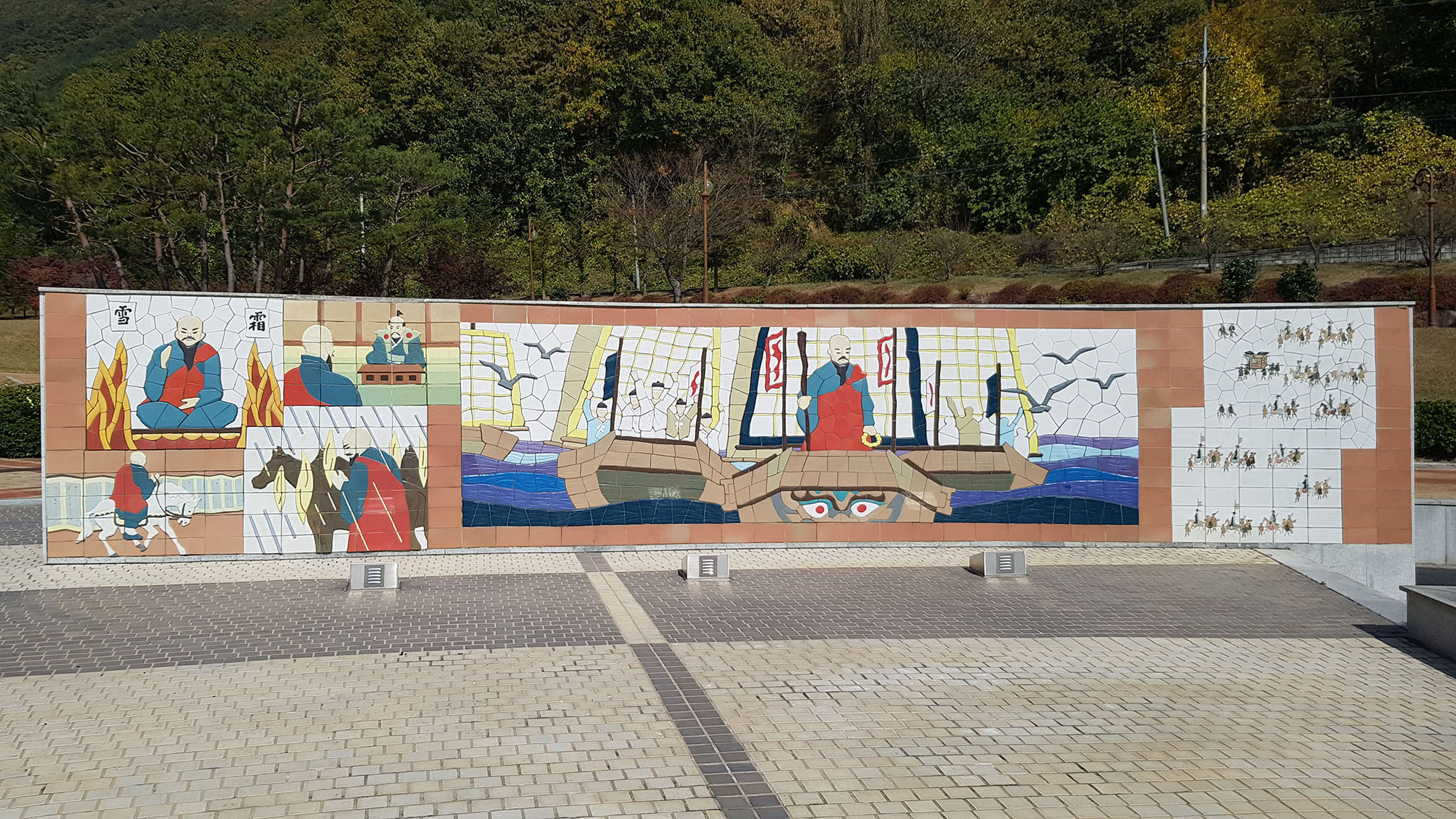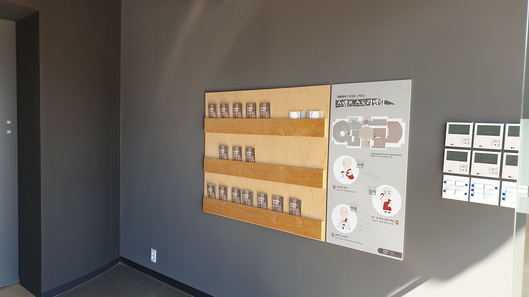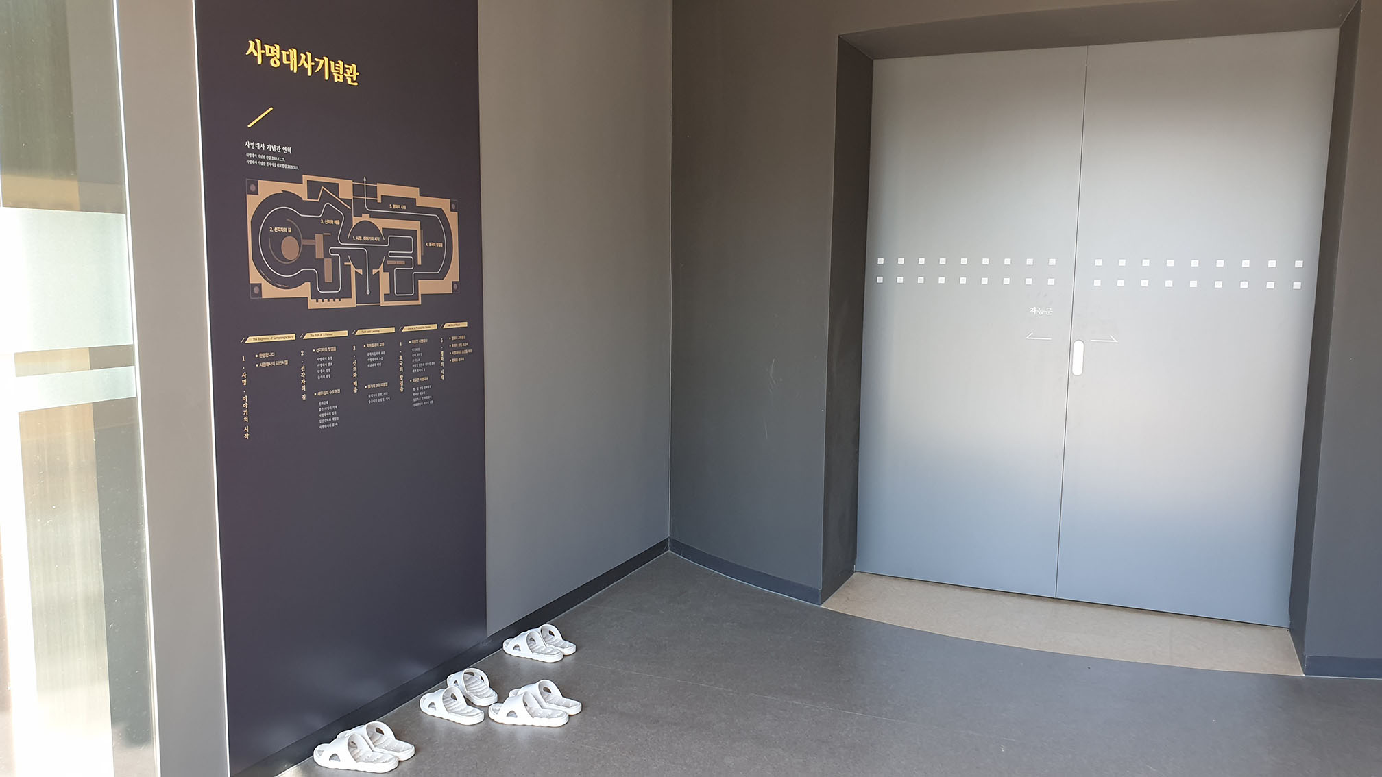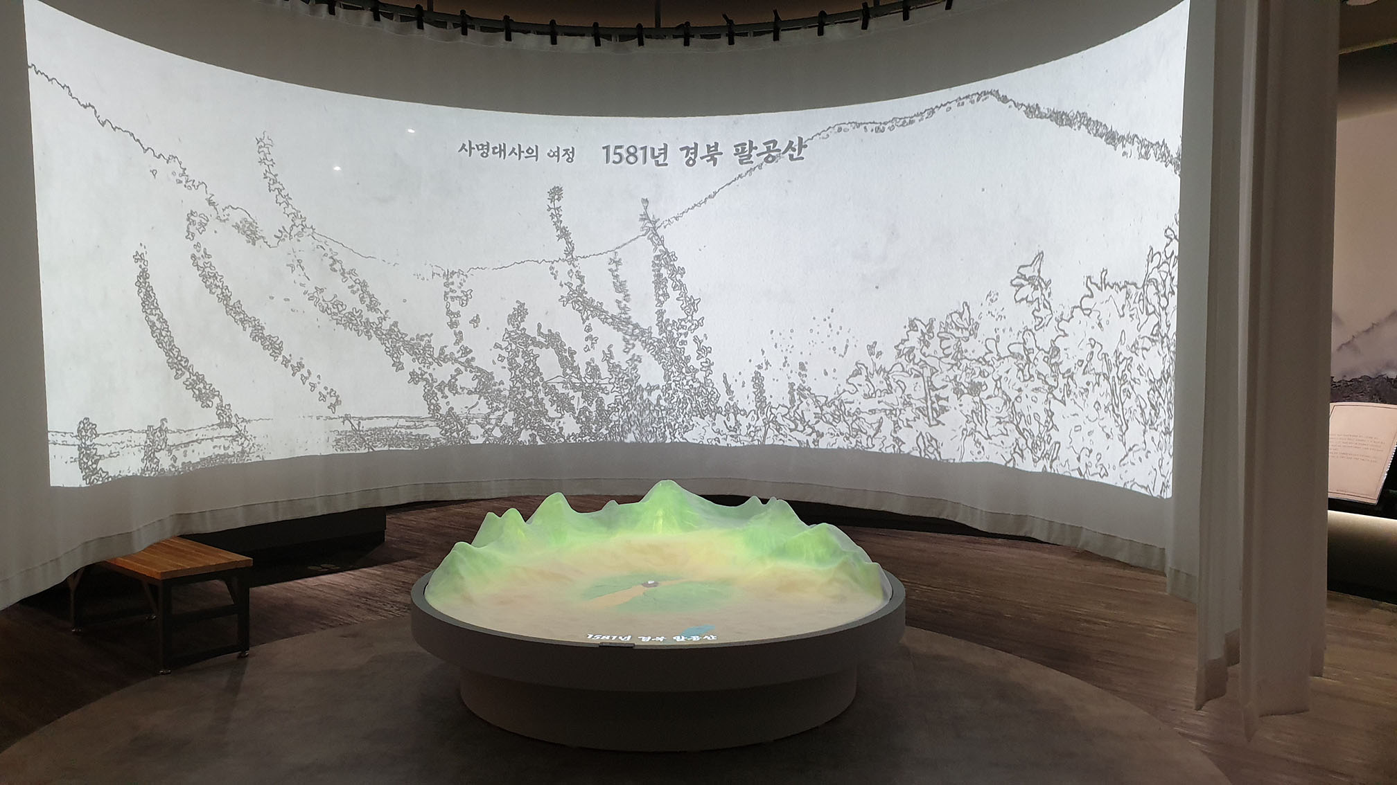 기념관/공원 옆으로는 이렇게 저수지가 나있는데 새로 만든 곳은 아니고 원래 농수용으로 쓰이던 저수지입니다.저수지쪽에서 바라보면 이런 느낌입니다.대문을 지나 들어가봅니다. 어흠~대문으로 입장하면 좌측에 관리실이 이렇게 자리잡고 있습니다. 우측으로는 화장실이 위치해있구요.기념관으로 가는 길이 뻗어 있습니다.가는 길에 사명대사의 활약을 타일아트로 만든 벽화가 보입니다. 외교활동에 관한 모습인것 같구요,다른 한쪽은 승병을 일으켜 이끄는 장수의 모습을 표현한 것 같네요. 기념관은 이렇게 생겼습니다. 문은 정중앙에 보이는 입구와 반대편으로 나있는 출구 두 곳 입니다. 기념관에 들어가기에 앞서. 기념관을 등지고 보면 이런 느낌입니다.현판에는 사명대사기념관이라고 쓰여있습니다.실내로 들어가기 전 전실의 역할을 하는 공간입니다. 슬리퍼는 걸음 소리가 나는 신발을 신은 관람객을 위한 용도인가 봅니다. 전시에 대한 안내가 적힌 팜플렛이 비치되어 있고 그 옆에 스탬프 순서가 나와있네요.내부로 들어가면 바닥에 공간구분을 해놓았고 순서에 따라 스토리에 맞춰 사명대사를 알아갈 수 있습니다. 첫 시작은 탄생과 함께...작은 모형으로 만들어 놓았지만, 퀄리티가 나름 상당합니다.어린 나이에 출가라니... 위인은 역시 다른가 봅니다.가장 기억에 남는 전시공간은 여깁니다.둥글게 둘러쌓인 커튼형태의 스크린에 시대상황을 설명하는 영상을 쏘고바닥에 놓인 구조물에도 싱크를 맞춰 사명대사의 활동을 풀어냅니다.천장에 이렇게 프로젝터가 설치되어 있지요.
