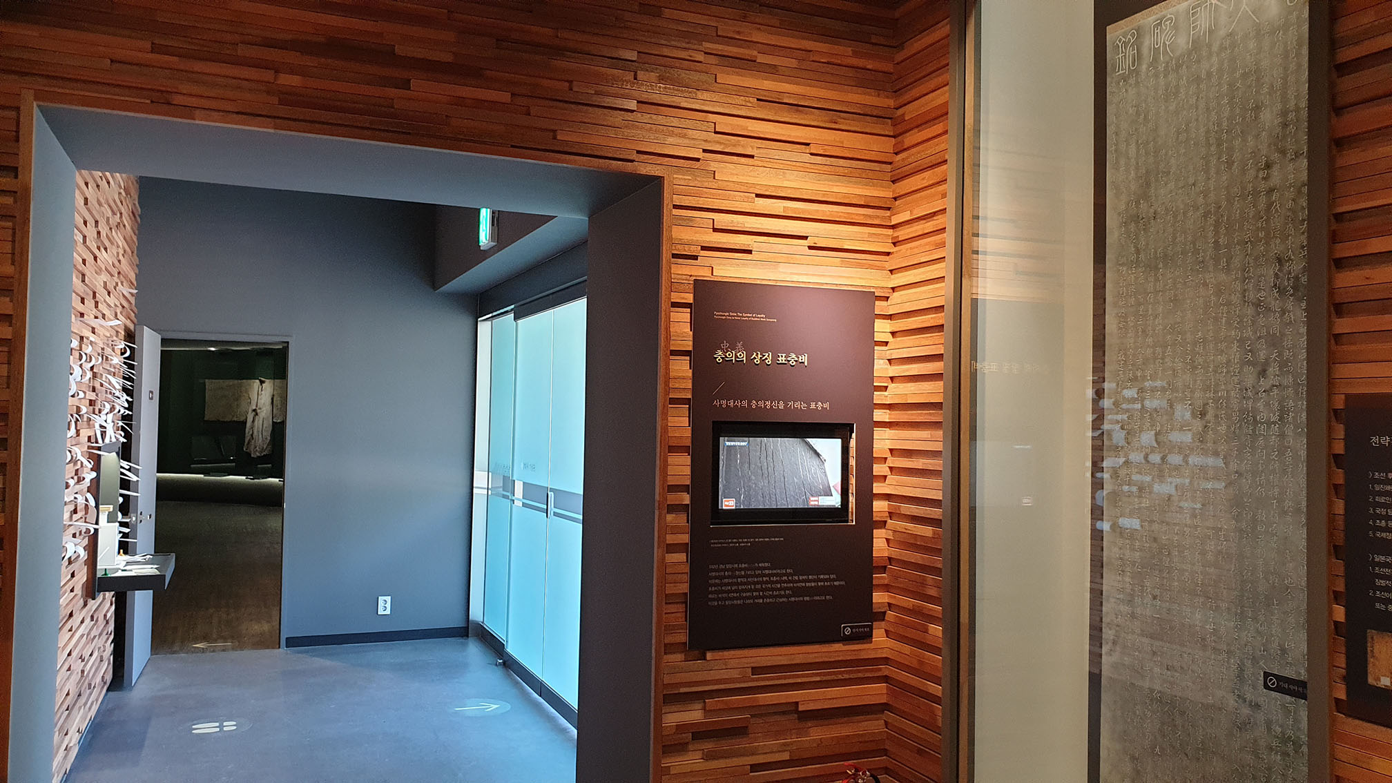 대화면으로 임진왜란을 설명하는 시청각실인데요,천장엔 이렇게 많은 화살이 달려있습니다.화살이 영상과 함께 노출될때 꽤 현장감있게 다가옵니다. 어린 아이들은 무섭다네요 ㅎ기념관을 다 둘러보고 뒷쪽 출구로 나가기 전입니다. 우측에는 표충비를 설명해놓았습니다.