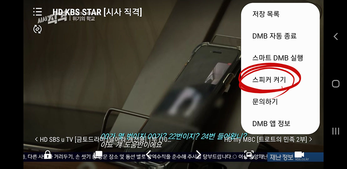 걱정마세요. DMB앱의 메뉴를 눌러보면 저렇게 스피커로 출력이 가능합니다.(이어폰이 꼽혀있더라도)