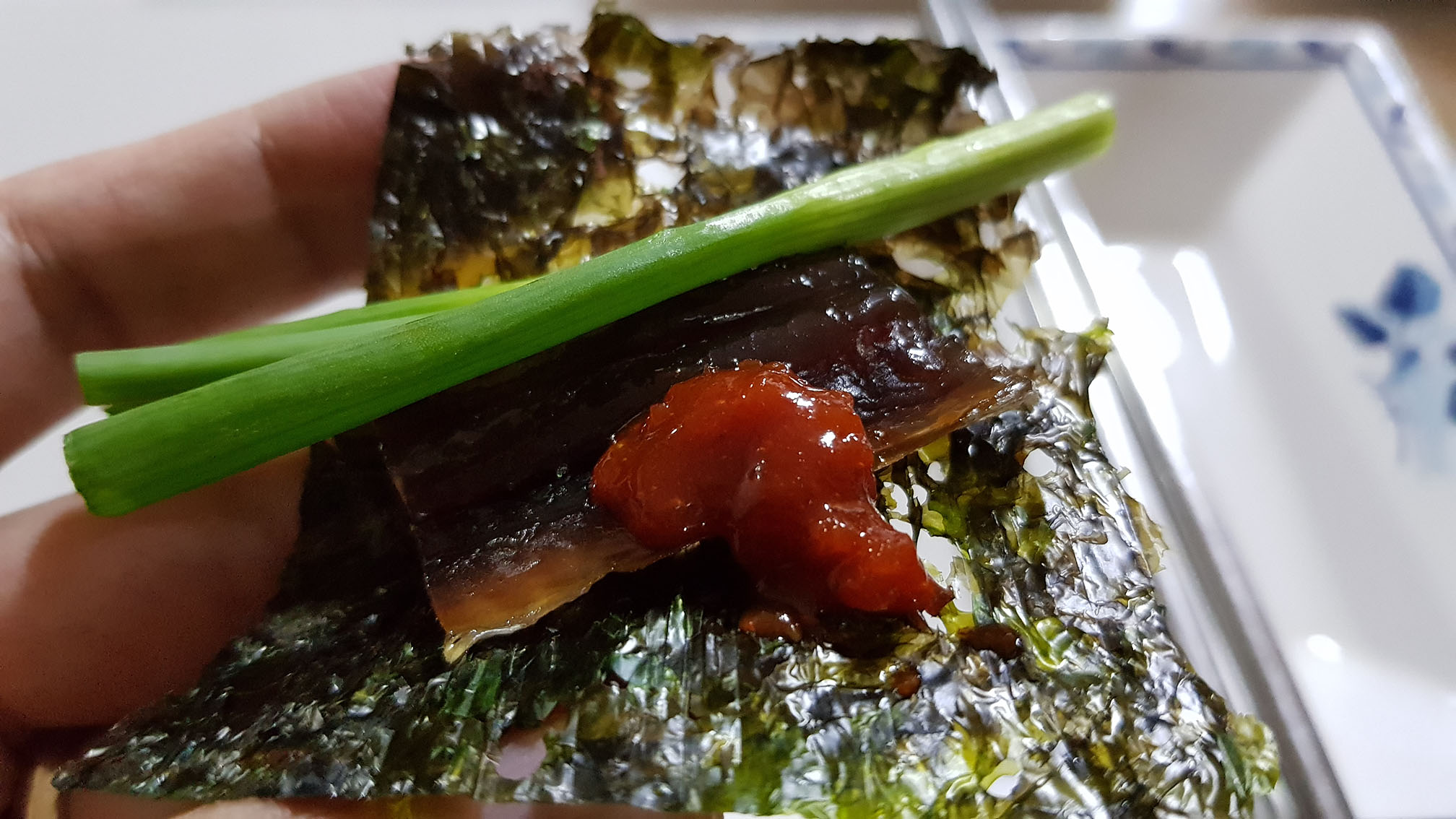 과메기의 맛과 향도 느끼며 느끼함도 덜한 조합은 사진처럼 김과 쪽파 그리고 초고추장으로만 먹는 형태가 제일 좋다 생각합니다. 하지만 개개인의 취향이 있으므로 이리 저리 시도를 해보며 자신만의 최적조합을 찾으면 됩니다.