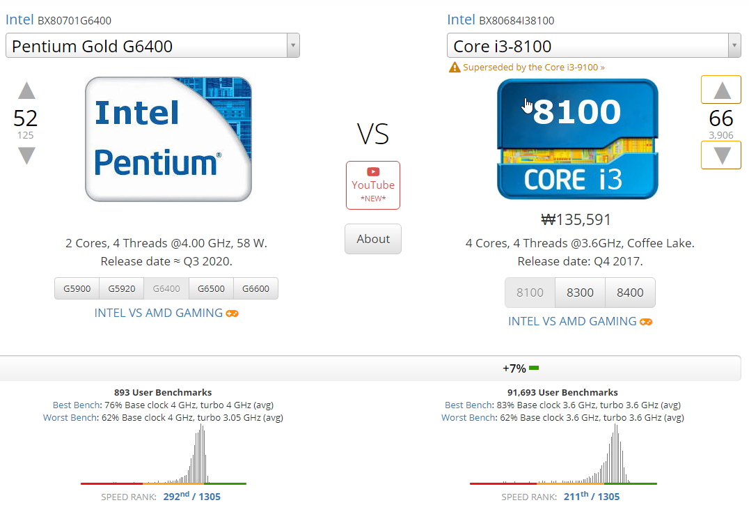 5년전에 산 i3-6100에 비해서는 292th VS 435th 정도로 순위격차가 발생(너무 당연하긴 하죠, 무려 5년전 제품과 ㅎ)
