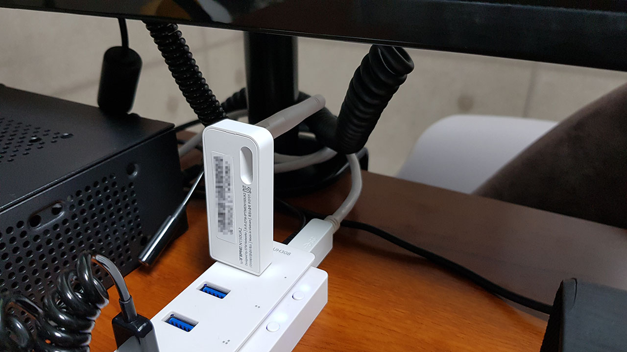책상 위, USB허브에 꼽아서 사용하다가 속도가 영 시원찮아서 이리 저리 안테나방향을 만져봐도 신통찮습니다.