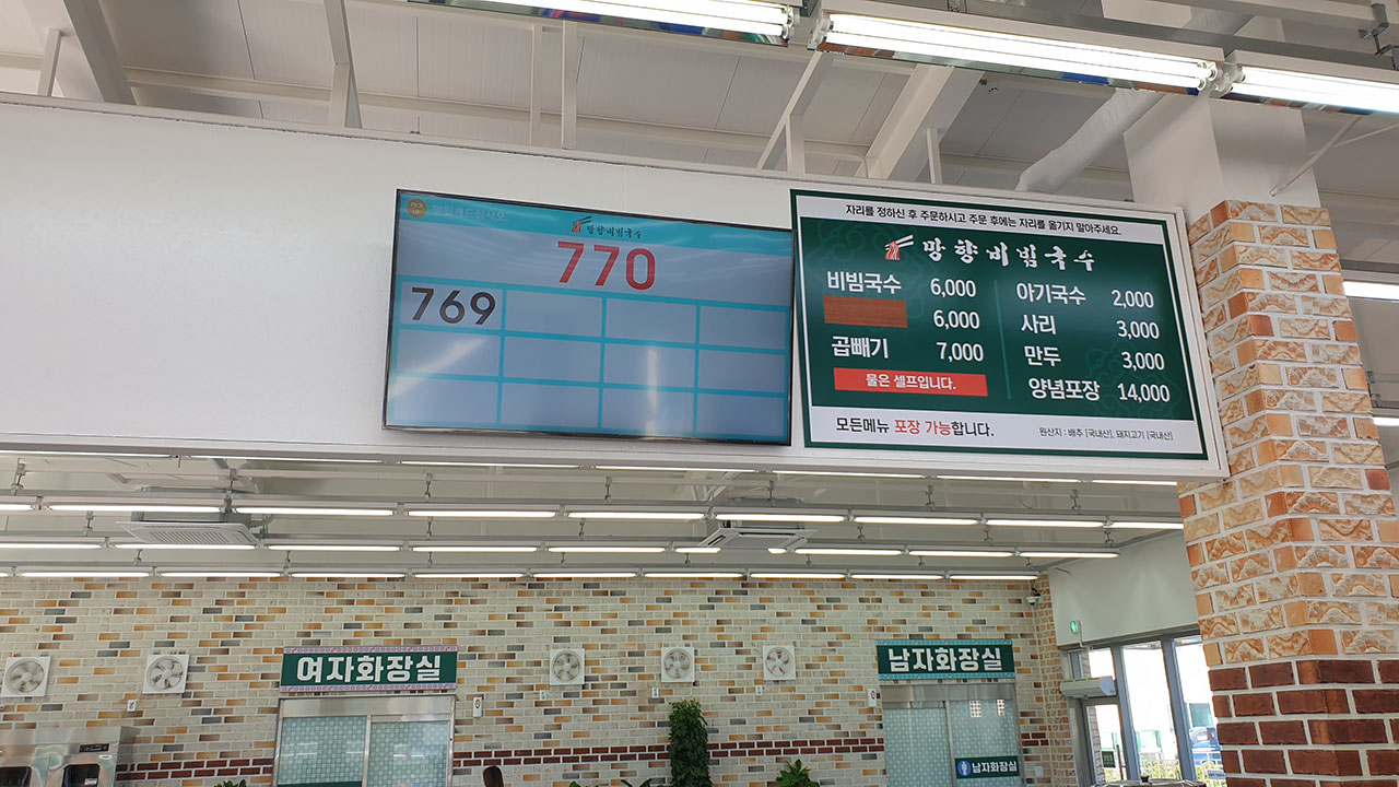 음식이 나오면 저렇게 전광판(모니터)에 주문번호가 뜨고 가져오면 됩니다. 물론 퇴실 시 반납도 직접해야합니다.