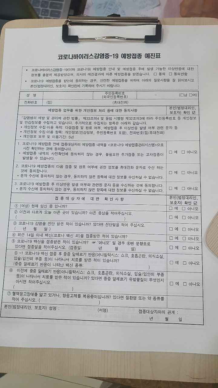 체온이 37.5도 이상이면 접종을 희망해도 주사를 놓아주질 않는다고 합니다. 사람이 정온동물인만큼 그럴 가능성은 드물겠지만, 여름의 뜨거운 기온에 백신접종에 들떠 병원으로 뛰어가다간 이런 이유로 자칫 접종에 실패할 수 있지도 않을까싶네요. 저는 정상체온이어서 아래와 같은 문진표를 이어 작성합니다.